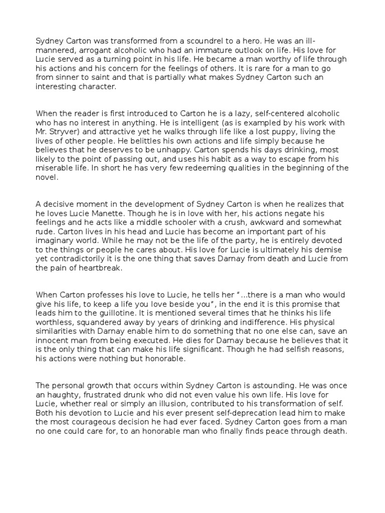 Look for evidence that offers clues as to Sydney Carton's personality. What kind of a person is Sydney Carton? Quote words and phrases from the novel that reveal important elements about Carton. Be sure to address these questions in your essay: What is Carton's opinion about himself? What negative traits does he possess? What positive ones? How does he exhibit these traits? Why a tale of two cities essay topics he seem to be such an outsider? Does your opinion of Carton change throughout the novel?